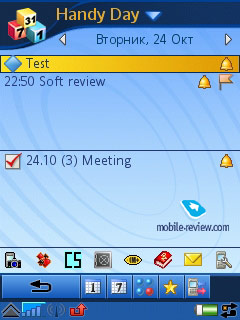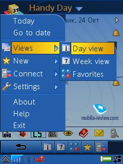 Иконка в виде звездочки позволяет сразу выбрать создание нового события или действия из списка, который аналогичен вызываемому из пункта «New». Последняя иконка предназначена для быстрого управления соединениями. Для создания любых событий, напоминаний или для совершения действий программа использует штатные средства платформы: календарь, редактор SMS/MMS-сообщений и т.д. Управление событиями, переход между днями в календаре можно осуществлять как при помощи стилуса, так и с помощью управляющего колесика JogDial.
