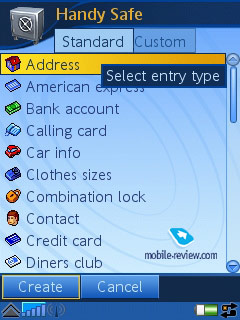 Позволяет вести учет за финансовыми расходами. Обзор утилиты для устройств на базе платформы S60 можно посмотреть здесь. Отличие текущей версии заключается в способе ввода информации. Для ввода можно использовать QWERTY-клавиатуру устройства или наэкранную клавиатуру. По умолчанию программа имеет ряд встроенных категорий, для каждой из которых можно задавать стоимость. Категории и список валют можно редактировать по собственному усмотрению. В качестве платежных средств допускается использование платежных карт, наличных средств, чеков, можно задать собственный источник оплаты. Учет расходов можно вести по категориям, одним из типов которых могут быть города. По каждой категории программа позволяет сделать индивидуальный отчет о расходовании средств. Финальный отчет можно экспортировать в MS Excel. ВпечатленияПрограмма является чрезвычайно полезной, но лишь при условии наличия привычки вести учет расходов. В качестве варианта «принудительного» использования программы могу предположить задание руководителя представлять детальный отчет о представительских или иных расходах, которые не подпадают под общеупотребительный перечень. Handy Safe