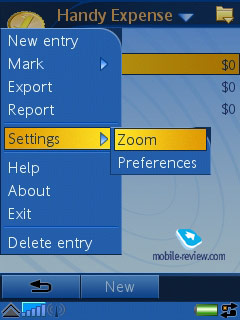 ВпечатленияНаибольшую сложность при освоении управления программой представляет идеология, связанная с наличием сенсорного экрана. Но это относится лишь к тем, кто привык иметь дело со смартфонами на базе платформы S60. Для пользователей, освоивших управление предыдущими UIQ-устройствами, оно никаких сложностей не составит. Да и привыкнуть к новому типу управления и отсутствию джойстика достаточно просто. У меня на это ушло несколько дней активной работы со смартфоном Р990i. После получения первоначальных навыков работа с программой доставляет удовольствие. Все очень логично, не требуется дополнительных нажатий для открытия нужного приложения, наличие «Избранного» позволяет скомпоновать их в одном месте. В качестве пожелания разработчикам можно лишь высказать предложение вывести главное окно программы в качестве скринсейвера на основной экран. В текущей версии работа с закрытым флипом также предусмотрена, но в виде самостоятельного запуска. Handy Expense