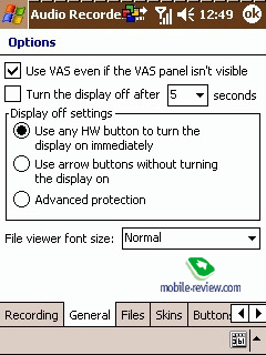 В окне «Files» настраивается путь к папке, в которую будут помещаться новые записи (по умолчанию это «Мои документы»), задается шаблон имени для сохранения. В качестве опции можно выставить сохранение каждой записи в отдельной папке. В окне скинов настраивается внешний вид программы. По умолчанию в комплекте идет только один скин (в портретной и ландшафтной ориентации дисплея), но с сайта производителя можно скачать дополнительные.