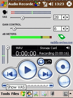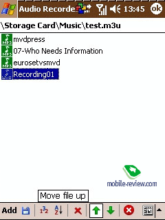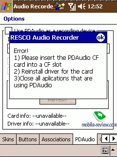 Программа имеет любопытную особенность. При использовании внешней карты PDAudio формата CF она может использоваться для записи трансляции непосредственно с эфира. При отсутствии такой карты эта опция недоступна, о чем и сообщается пользователю.