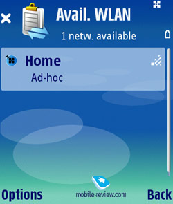 Имя точки доступа можно ввести вручную или воспользоваться опцией поиска. Задав поиск, мы получили в качестве доступной сети «Home». Дальнейшие настройки предполагают установку различного статуса создаваемой сети. Сеть может быть открытой, скрытой, работать в режиме Ad-Hoc или Инфраструктура и использовать самые разнообразные механизмы шифрования. Поскольку исследование защищенных механизмов в данную задачу не входило, мы использовали самый простой вариант одноранговой открытой сети без использования шифрования. При подключении к такой сети выдается предупреждение о том, что сеть полностью открыта для внешнего доступа. На этом создание сети можно считать законченным. Отмечу, что не пришлось вводить сетевой адрес для смартфона N80, но реализация протокола UPnP не может считаться полной. Впрочем, технология делает первые шаги, и определенные издержки вполне объяснимы.