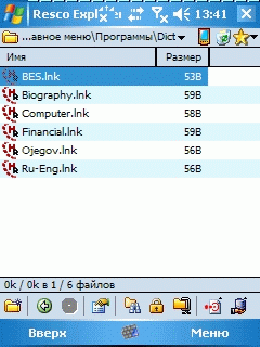 Открываем свойства ярлыка (долгий клик по названию/Свойства/окно Ярлык) и дописываем в конец строки через пробел параметры запуска –d –p:Название словаря. Параметр –d позволяет запускать программу в режиме словаря, параметр –p устанавливает индивидуальные настройки для каждого словаря, а название словаря позволяет вам наглядно видеть, какой словарь вы будете активировать. В случае, приведенном на скриншоте, аббревиатура BES соответствует Большому Энциклопедическому Словарю. Это название может быть любым, но оно должно отражать тип словаря и облегчать вам выбор нужного файла. Подтверждаем выполненные действия (кнопка «ОК» в верхнем углу) и переименовываем сам ярлык (длинный клик/Переименовать). Затем создаем несколько дубликатов ярлыка, для каждого из которых вводим значения параметров и название. Количество дубликатов должно соответствовать количеству файлов формата dic, которые вы скопировали в соответствующую папку. У меня в итоге получилось 6 словарей, для каждого из которых ярлык имеет общие значения параметров и уникальное название. На этом работа с Resco Explorer закончена.