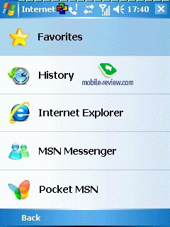 Включает в себя непосредственно Интернет браузер, папку избранного, MSN Messenger и Pocket MSN. Программы сторонних разработчиков тоже не отображаются.