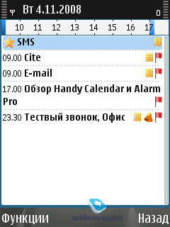 ![]() В остальном программа имеет стандартные опции просмотра временных интервалов и сортировки событий. Теперь о недостатках. Несомненно, программа существенно расширяет функции стандартного календаря Symbian S60. И очень странно, что она не умеет делать одной достаточно очевидной вещи - без дополнительных клиентов синхронизировать данные с внешними календарями. Например, с календарем Google. Естественно, если вы запустите программу синхронизации, то данные в календаре будут обновлены, но сделать это непосредственно из программы нельзя. Второе пожелание к разработчикам прошу рассматривать именно как пожелание. На мой взгляд, в программе не хватает возможности сортировки событий по ключевым словам или самостоятельно настраиваемым фильтрам. Я надеюсь, что из приведенного текста суть пожелания ясна. Хотелось бы иметь возможность создавать структурированные записи (например, напоминания или любые другие), а затем по ключевым словам получать на экране отчет за указанный период времени. Например, получать отчет о том, сколько отправлено статей на сайт (смайлик). Или насколько велик перерасход денежных средств, и каким образом его нужно скорректировать в условиях мирового финансового кризиса. Во всем остальном претензий к программе нет, и я наконец стал отмечать в календаре все необходимые мероприятия и особенно звонки. Согласитесь, что нажать на кнопку вызова намного проще, чем получить напоминание о необходимости сделать звонок и потом искать в адресной книге нужный контакт. При использовании предложенного разработчиками подхода некоторые данные вообще можно не заносить в адресную книгу. Особенно если это хоть и важный, но разовый звонок. Handy Alarm ProОсобенностью новой версии будильника является возможность устанавливать несколько типов напоминания. Среди них простое напоминание, напоминание о необходимости совершить звонок (контакту из телефонной книги или на произвольный номер), голосовая заметка или импорт напоминания из заголовка SMS-сообщения.