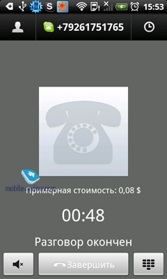 If you store several numbers you will see a window to choose the right one. When the call starts you see a key to end it, microphone shutdown buttons and its cost in progress. After the call you get the information on its total price.