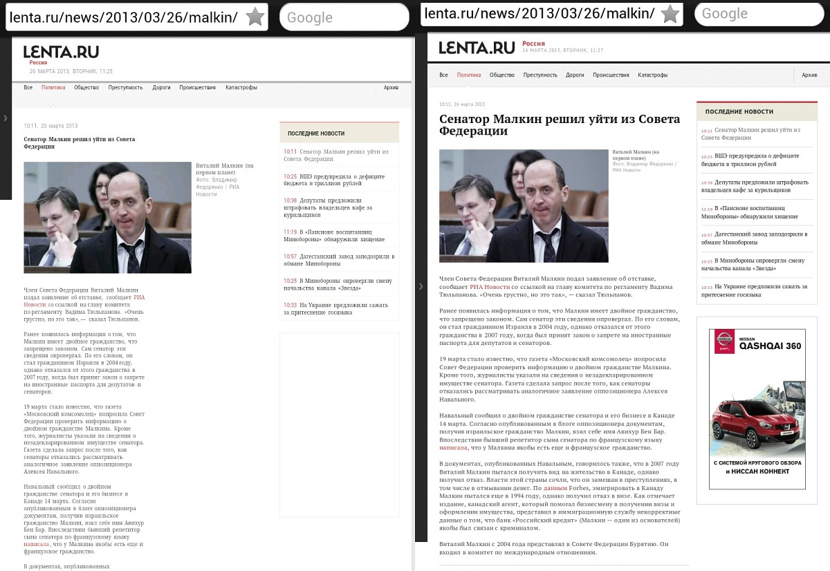 Все было хорошо до тех пор, пока Opera Mini не затеяла «собирать информацию о моих шрифтах» с завидной регулярностью и подолгу, третий по счету заход длился часа полтора-два. Сейчас уже могу предположить, что браузер пытался таким образом обновиться без загрузки новой версии из «Маркета», но я так и не понял, зачем ему было идти таким непростым путём. Во всяком случае, имейте в виду. При появлении аналогичного «долгоиграющего» безобразия разумнее браузер сразу переустановить. Номер версии меняется на пару цифр после второй точки, и проблема исчезает. Пока разбирался с вопросом, решил все-таки попробовать Opera Mobile. Мало ли, вдруг понравится, а настройки-закладки Opera Mobile импортирует из аккаунта Opera с таким же успехом. Ничего, оказалось вполне приемлемо, хотя рекламы и навязчивых окон-предложений «зарегистрироваться», «подписаться», «залайкать» и прочих советов приобщиться вылезает намного больше. Одно неудобство: читать Twitter по ссылкам вида https://mobile.twitter.com/user эта Opera Mobile категорически отказывается, выдает пустую страницу. А читать бывает полезно и познавательно. Может, подскажете, где тут «собака порылась»? Сергей Потресов (sergey.potresov@mobile-review.com) Поделиться: Мы в социальных сетях: |