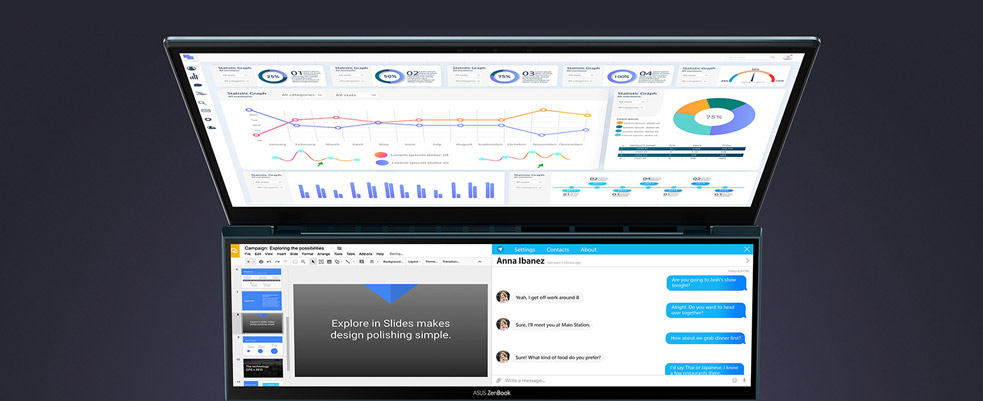 Тонкий и легкий ноутбук, соответствующий требованиям новейшего стандарта Intel Evo для решения повседневных творческих и бизнес-задач. Благодаря наличию второго сенсорного экрана во всю ширину корпуса, ZenBook Duo 14 позволяет эффективнее работать в многооконном режиме, когда все задачи не умещаются на одном экране.